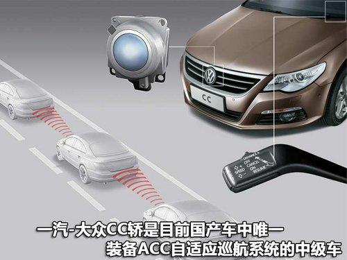 一汽-大眾CC轎跑車是目前唯一裝備ACC自適應巡航的國產車型,提升了舒適性和安全性。除此之外,Front Assist預碰撞安全系統、Lane Assist車道保持系統、Park Assist智能泊車輔助系統以及Rear Assist后視影像系統也均出現在一汽-大眾CC的高配車型上。