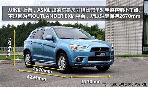 ASX勁炫是自2010年2月開始在日本銷售的豪華緊湊型SUV(RVR)的中國版車型。它繼承了帕杰羅的越野血統(tǒng),兼?zhèn)淞藲W藍德EX都市型SUV的性能。通過緊湊的車身設(shè)計、搭載的低油耗發(fā)動機、以及鮮明運動風格、加上18至24萬元之間的售價區(qū)間,使ASX勁炫在國內(nèi)同級別市場中有不錯的競爭實力。