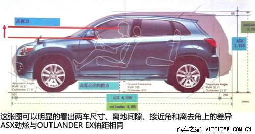 ASX勁炫和OUTLANDER EX同平臺且軸距相同,但在車身尺寸、離地間隙、以及接近角和離去角上都有差異,從下圖中可看出數(shù)據(jù)上的差別。