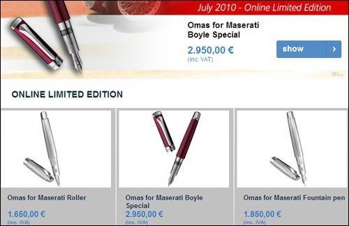 從上面的截圖可以看出,Omas for Maserati)簽字筆的售價為1650歐元,同樣銀色外觀的墨水筆售價為1850歐元,而Boyle Special是為紀念瑪莎拉蒂傳奇車型8 CTF而推出,限量生產(chǎn)70只,并且配合限量版8 CTF Boyle Special收藏車型一同發(fā)售。