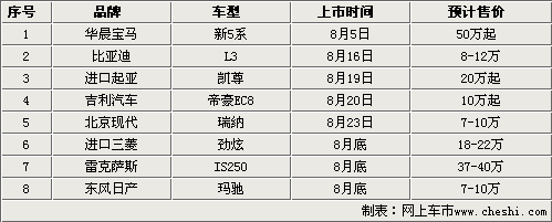 時間進入到8月份以后,我國絕大部分城市都已經進入到了真正的夏天,伴隨著酷熱的天氣各大汽車廠商也紛紛選擇了盛夏時節,發布他們自己的最新產品。據記者統計,在2010年8月份里來自國產和進口各類新車達到了8款之多,平均每周就有就有2款新車與我們見面。對于要即將上市的新車,消費者的關注度自然是很高的,下面就讓我們提前去看看。