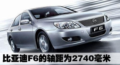 比亞迪F6長4846mm,寬1822mm,高1465mm的車身,2740mm的軸距,提供寬敞舒適的的駕乘空間;同時也提供了高端配置。例如在駕乘舒適性方面,F6新財富版2.0L尊貴型擁有雙層雙模天窗、雙溫區獨立控制自動空調、方向盤音響控制系統、DVD多媒體系統以及NAVI語音導航系統等配置。
