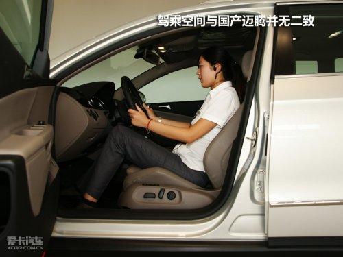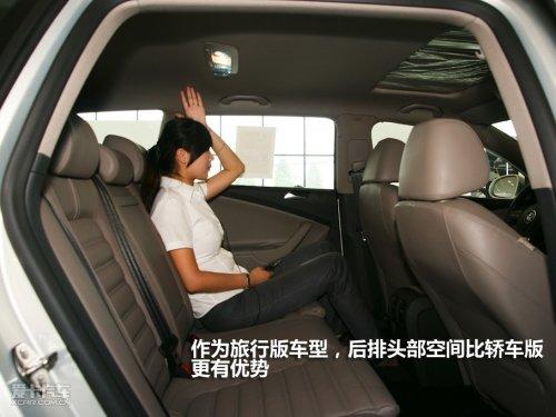 由于車頂曲線在到達C柱時不需要快速的下滑,旅行車后排頭部空間往往較轎車版本更有優勢。從圖中可以看出模特MM坐在后排,其頭部空間可以稱之為奢侈。而PASSAT旅行版與國產邁騰一樣,都未對軸距進行加長,所以腿部空間并無太突出表現,但對于模特MM而言已完全足夠。