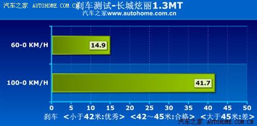 長城汽車的剎車一直得到較高的評(píng)價(jià),我們對(duì)1.3L車型進(jìn)行的剎車測(cè)試中,車輛全力剎車,車速從100-0KM/h的最短制動(dòng)距離為41.7米,系統(tǒng)的穩(wěn)定性處于中等水平,剎車成績還是不錯(cuò)的,我們比較滿意。
