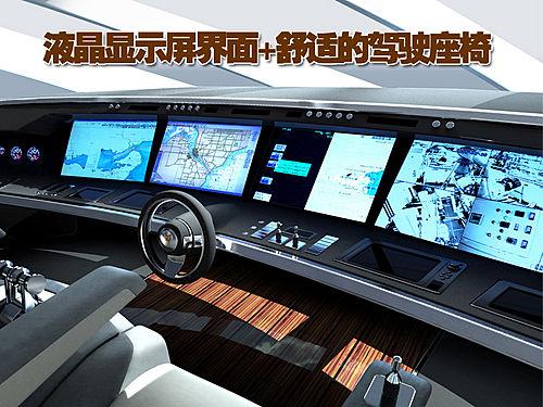 從官方設計圖上我們可以看到起奢華的內部裝飾,液晶顯示屏的操控界面,寬大舒適的駕駛艙座椅,在其船艙還配置了寬敞的酒吧間,木質的地板以及灰色的裝飾增添了雅致的風格。此外還有舒適的長沙發以及小型會議桌等等。