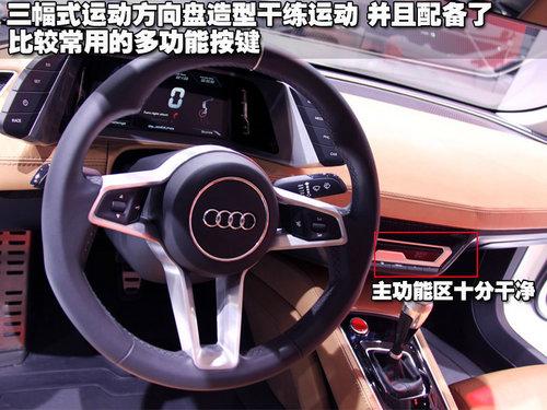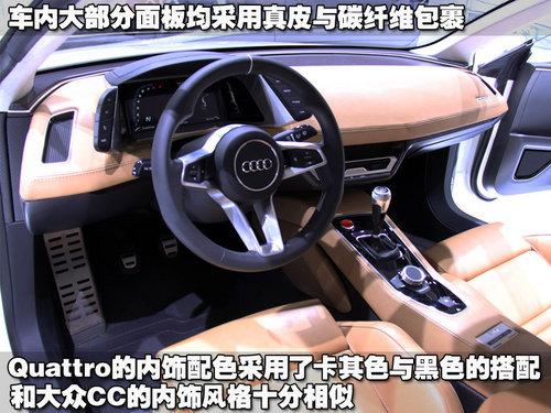 奧迪Quattro概念車的內飾風格與大眾CC十分相似,都采用了卡其色和黑色的配色。奧迪Quattro概念車的內飾面板用料基本上僅有兩種材料,真皮和碳纖維。