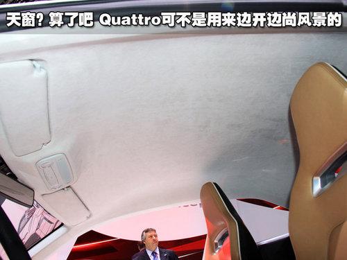 通過這張圖我們可以看出奧迪Quattro概念車并未配備天窗,不過大家也不必疑問為何這樣一款好車連天窗都沒有,對于奧迪Quattro概念車來說,它的用途可不是欣賞風景,競速才是它的真正目的。