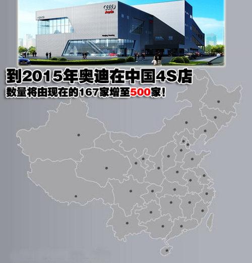 奧迪在國內的熱銷使得現有的經銷商在數量方面已經不能滿足日益發展的需要,為了更好的為客戶服務,奧迪在未來將持續提升經銷商網絡的數量和質量。預計到2015年,奧迪在國內的經銷商數量將從目前的167家上升到500家,覆蓋大部分中國主要城市,讓客戶更便捷的能享受到周到的服務。