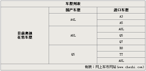 目前,奧迪在國內銷售的產品線已經非常豐富。其在中國本土已經銷售了百萬輛的奧迪A6是國內高級公商務轎車銷量的龍頭老大,而加長的奧迪A4L在中高級轎車市場也有著不俗的表現。奧迪Q7、Q5處于一車難求的境地。