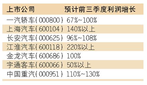 在車市產銷兩旺的背景下,汽車股前三季度業(yè)績狂飆。截至上周,大部分整車汽車股發(fā)布前三季度的業(yè)績預測,多數(shù)前三季度的凈利潤增長超過100%。良好的業(yè)績也刺激著汽車股股價不斷創(chuàng)出新高,由于業(yè)界猜測鼓勵汽車消費的政策可能在今年到期,因此到年底還將迎來一次銷售的大好形勢。