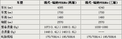 現代瑞納VERNA與i20同平臺生產,兩廂車型在前臉設計上與三廂不會有太大的不同,車身尺寸上除了長度外,其他與三廂車型基本相同,三廂版瑞納,寬為1700mm,高為1460mm,軸距為2570mm,車身比雅紳特要大了不少。關于兩廂版瑞納的詳細信息請參見下表: