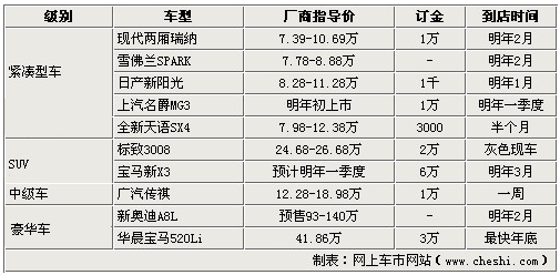 本屆廣州車展上市新車并不比北京車展多,但是所上車型基本都屬于重量級產品。據(jù)各廠家經銷商銷售人員表示,十款新車大部分目前都已經開始接受預定,并且提車時間也都集中在2011年初的第一季度,相信喜歡這些車型的朋友們如果要出手的話,現(xiàn)在就可以進行預定了。