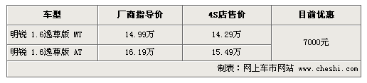 雖然明銳1.6逸尊版僅上市1天,但經(jīng)銷商已經(jīng)放出7000元的現(xiàn)金優(yōu)惠,如果希望店內(nèi)送裝飾,可優(yōu)惠現(xiàn)金6000元。但目前現(xiàn)車較緊張,需要訂車,訂車最快也需要20天左右,如果訂購車輛顏色較少,需等一個半月時間,定金為5000元。