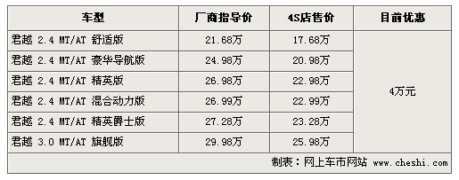 據4S店銷售人員介紹:由于新君越臨近上市,所以目前銷售的君越有大幅降價,最高降幅達到4萬元。目前除了混合動力版需預定外,其他車型貨源充足,全系優惠4萬元。混合動力版預訂需等一個月時間,訂金1萬元。