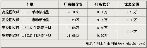 據經銷商處銷售人員介紹,賽拉圖歐風全系最高出現1.78萬元的優惠。賽拉圖歐風在售的有4個車型,入門級的1.6L手動標準版的優惠金額為1.18萬元,售價從廠商指導價9.18萬元降到8萬元,1.6L豪華版的手動版和自動版車型都經全系最高1.78萬元優惠后,售價分別降至8.8萬元和9.9萬元。銷售人員還介紹,目前賽拉圖歐風車型比較緊張,現車數量一般。