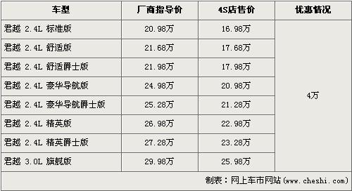 今年的7月8日,別克終于推出了帶著家族新元素特征的中級(jí)車市場的又一力作-新君越。新君越的加入無疑給別克軍團(tuán)再次打了一針“興奮劑”,其與新君威形成了很好的市場互補(bǔ)。別克經(jīng)銷店已經(jīng)可以接受新君越的預(yù)訂工作,訂金為10萬元,并且為了清理老款君越的庫存車,老君越出現(xiàn)了全系降4萬元的優(yōu)惠,具體價(jià)格請(qǐng)看下表: