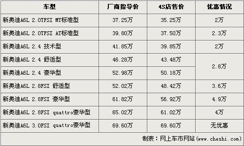 據(jù)銷售人員介紹,目前奧迪A6L全系可以最高優(yōu)惠4.9萬元。奧迪A6L全系分為2.0T FSI,2.4L,2.8 FSI,3.0 FSI四種共10個(gè)車型,最低配的2.0TFSI標(biāo)準(zhǔn)型經(jīng)2萬元優(yōu)惠后售價(jià)降到了35.25萬元,而2.8FSI 豪華版經(jīng)全系最高的4.9萬元優(yōu)惠后售價(jià)也降到了56.92萬元。全系最高配的3.0FSI quattro豪華版目前店內(nèi)沒有現(xiàn)車,欲購買的消費(fèi)者需要交1萬元訂金,約等3個(gè)月后方可提車。
