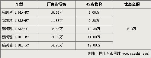 據4S店銷售人員介紹,新凱越分為1.6L與1.8L兩種排量車型,目前新凱越全系優(yōu)惠2.3萬元,較上個月的優(yōu)惠降幅有所上升。經優(yōu)惠后,全系最低配的1.6LX-MT車型售價下降到了8.08萬元。經優(yōu)惠后,1.8L手動和自動兩款車型售價也下降到了11.08萬元和12.68萬元。銷售人員還介紹,目前店內現車齊全,是消費者挑選的較好時機。