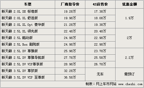 在中級車行列中,新天籟在舒適性和空間方面具有自己獨特的優勢,尤其在車內部座椅的乘坐感受方面,可謂獨樹一幟,新天籟在一系列升級后成為消費者選購的熱點車型之一。根據網上車市價格監測系統顯示,新天籟為增加市場競爭力,優惠幅度有所加大,全系最高優惠2.2萬元。具體行情如下: