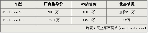 據北京寶馬經銷店銷售人員介紹,現在在售的X6車型分為售98.3萬元的35i車型和售價為177.8萬元的50i兩款車型。目前購買35i車型的消費者沒有優惠,提現車還要加價2.5萬元,售價從98.3萬元上升到了100.8萬元,排量更大的4.4升的50i車型有32萬元的現金優惠,售價降到了145.8萬元。銷售人員還介紹,近期50i車型車型沒有現車,消費者需交訂金10萬元,下個月可提車。