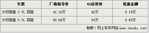 據經銷商銷售人員介紹,大切諾基3.7L車型的優惠金額僅為1900元,而高排量的5.7L車型優惠金額達到了5.69萬元,達到了全系的最高。在售的Jeep-大切諾基共分為3.7L四驅和5.7L四驅兩個車型。3.7L四驅型經1900元優惠后,售價降為了42萬元。而排量稍大的5.7L四驅型經5.69萬元優惠后,售價降為了54萬元。