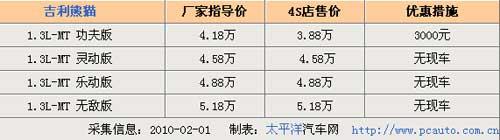 近日,筆者從北京吉利4S店了解到,目前該車的優惠幅度比較穩定,手動擋車型功夫版外均有4000元的現金優惠,但現車方面僅有功夫版車型有少量現車,有意向購買的消費者可要抓緊了。詳情請見下表: