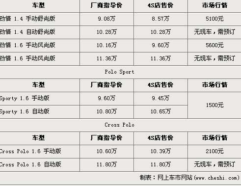 據上海大眾北京經銷店銷售人員介紹,兩廂Polo分為勁情、Sporty以及Cross版三種車型,勁情版的手動舒尚版以及手動風尚版有現車,并且手動風尚版的5600元優惠現金達到了全系的最高。而Sporty版車型店內有現車,主要顏色為銀色車型,并且有1500元的現金優惠。Cross版車型手動版有現車,并且有1500元的現金優惠。欲購買無現車的消費者,需交訂金1000元,約等1個月可提車。