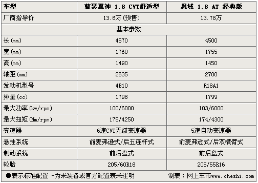這次選擇的兩個車款是價格比較接近的,僅差1800元且都是自動擋,首先在基本參數上,藍瑟翼神要比思域車身略長一些,但在軸距上思域要略有優勢,這在內部空間上將有所體現。在動力上,藍瑟翼神與思域的1.8L發動機在參數上比較接近,但在變速器上藍瑟翼神裝備的是6速CVT變速器更先進一些。在懸掛系統方面,藍瑟翼神的后五連桿式也要比思域的雙橫臂式乘坐舒適性更好一些,但維護成本要高一些。