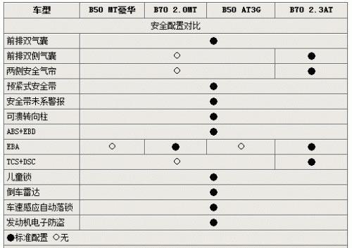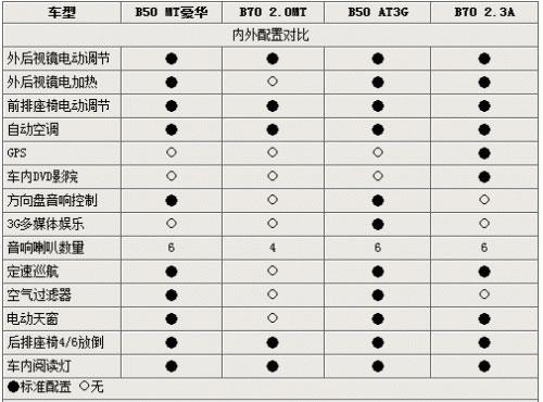 通過此項的對比,可以發現兩款兄弟車型在外觀以及內部的絕大多數配置均極為近似,僅僅是在高配車型之上有了一些不同的豪華系統,如B70 2.3AT豪華車型上的GPS以及DVD系統,還有B50 AT3G版之上的多媒體娛樂系統等等。而B50全息均配備了定速巡航系統,也是新車的一大亮點!