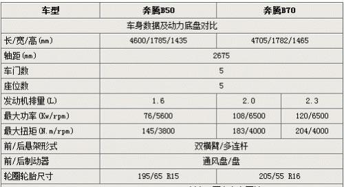 一汽奔騰新款轎車-B50即將在5月16日正式上市,作為向下擴展的重要車型,它被一汽寄予了很大的期待。據悉,B50將推出1.6L的手動、自動5個型號的車型,分別為1.6L MT豪華型、1.6L AT 豪華型、1.6L MT 尊貴型、1.6L AT 尊貴型及特別的1.6L AT 3G型,這里就將這款新車與B70做一個詳細的配置對比,看看兩款兄弟車型到底區別在那里。