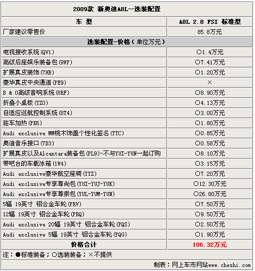 以上的選裝配置需要在預訂車輛前選擇好,經銷商會根據客戶的訂單向廠家發送配置代碼。09款奧迪A8L的選裝配置十分豐富,完全可以滿足對配置有需求消費者的“苛刻”要求。當然,這些配置也需要不菲的金錢才可以擁有,究竟哪些配置適合有品位懂得享受的您呢?