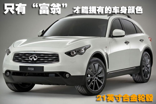 英菲尼迪FX“百萬富翁版”以F50S運動版為基礎開發而成,這款車型僅有獨特的月光白與曜石黑色兩種專屬的車身顏色可供選擇;疑21英寸“渦輪”造型輕合金輪轂是整車造型的亮點,更顯霸氣。