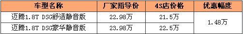 近日,愛卡汽車網從北京捷亞泰一汽大眾4S店得到消息,邁騰1.8TSI DSG的靜音版車型現在可以優惠1.48萬,最低售21.5萬。