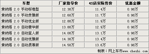 索納塔作為北京現代銷售的第一款車型,在中國地區銷售了已經快7年了。隨著新車型的增加,索納塔已經漸漸的失去了市場競爭力了。在4月的上海國際車展上,北京現代展出了自主研發車型新索納塔BT01,一經亮相就立刻受到了中國消費者的關注。近日我們從北京現代內部人士處獲悉到,主研發車型新索納塔BT01將于7月份正式推出。與此同時,根據網上車市價格監測系統顯示,目前銷售的索納塔全系均出現了大幅優惠,2.0標準版車型的售價僅為11.4萬。具體車型售價見下表: