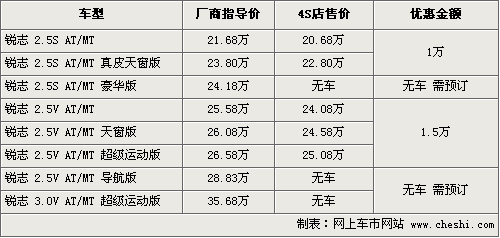 筆者從一汽豐田經(jīng)銷商處了解到,目前銳志全系可以優(yōu)惠現(xiàn)金1-1.5萬。除普通版車型外,銳志還推出了幾款特別版車型,售價相差并不大。目前2.5S標(biāo)配車型以及2.5V有部分現(xiàn)車供應(yīng),主要有銀色、黑色、白色等車。而豪華版、導(dǎo)航版車型還需要預(yù)訂。
