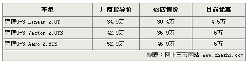 據4S店銷售人員介紹:目前薩博9-3現車較充足,最高優惠可達6萬元,標準型薩博9-3目前優惠4.5萬。如需訂購顏色較少的車,等待時間在1-2周左右。