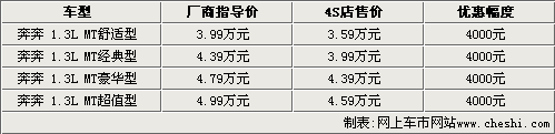據長安轎車4S店銷售人員介紹,奔奔目前現車都比較齊全,但與上月相比,優惠幅度明顯有所減少。目前奔奔1.3L四款車型只能優惠4000元,比上個月少1000元。但銷售人員也表示,如果消費者到店詳談,還可能有進一步優惠的余地。