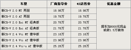 據(jù)4S店銷售人員介紹,目前購買本田CR-V仍需要加價(jià)提車,需要加現(xiàn)金8000元或者加1.5萬元的全車裝飾,裝飾包括了腳墊、尾翼、行李架、踏板等。消費(fèi)者可根據(jù)需求選購,但是必須達(dá)到1.5萬元的消費(fèi)金額。目前2.0和2.4自動(dòng)檔有黑色、銀色現(xiàn)車供應(yīng),其他特殊顏色還需要預(yù)定。