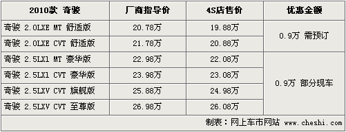奇駿2010款新車在10月28日正式上市銷售,新款在外觀、配置等方面進(jìn)行了一些列升級,但是價格并沒有做出任何調(diào)整。根據(jù)網(wǎng)上車市價格監(jiān)測顯示,目前購買2010款奇駿可享受9000元的現(xiàn)金優(yōu)惠,但低配車型現(xiàn)車緊張需預(yù)訂,具體參考如下: