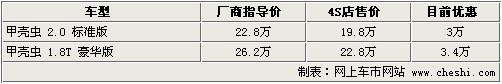 據4S店銷售人員介紹:目前甲殼蟲硬頂版本車型共有2款,2.0升與1.8T車型店內均有現車,2.0升車型目前顏色較為齊全,有綠色、紅色、米色、黑色、藍色車款,最高可優惠3萬元,1.8T車型指導價改為26.2萬元,優惠后僅為22.8萬元。