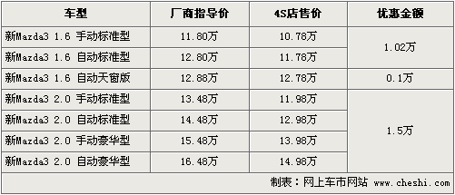 馬自達3自4月份1.6L的自動天窗版車型上市以來,一直受到消費者關注。運動與操控完美結合讓馬自達3擁有較好的口碑。根據網上車市價格監(jiān)測系統(tǒng)顯示,馬自達3現最高優(yōu)惠1.5萬元,1.6L有少量現車供應。具體行情如下:
