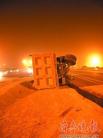 6日凌晨1時(shí)許,在濟(jì)南經(jīng)十路與千佛山路交叉口,一輛滿載沙子的斯太爾大貨車與一輛小轎車相撞,大貨車側(cè)翻將小轎車壓在了身下,沙子撒了一地,汽油從油箱里漏了出來,在路面上形成了很大一片油漬。小轎車的駕駛員位置被大貨車壓扁,車身后部則被沙子掩埋。