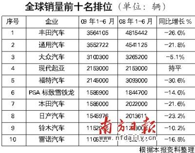 處于危機中的市場,誰能最低限度地保持自己的跌幅,誰就贏得了市場。近日,美國汽車新聞(AutomotiveNews)公布了2009年上半年各家汽車廠商在全球的銷量資料,現(xiàn)代汽車表現(xiàn)出足夠的抗跌性,已經(jīng)超越福特汽車,爬升至全球老四的位置。而經(jīng)過鳳凰涅槃的通用汽車,上半年的銷量則縮小與豐田的差距,有可能重新奪回世界銷量第一的寶座。目前,在世界排名前10的廠商中,亞洲車企獨占一半,歐洲車企有3家,美國則只剩下了2家。經(jīng)歷了一場浩劫般的危機后,世界汽車市場的格局有望重新排列。