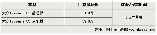 據銷售人員表示,途歡Tiguan進口車型目前已接受預訂,訂金為5萬元,最快在7月份左右可以提到現車。無論途歡Tiguan舒適版還是豪華版兩款車型,都將標配四輪驅動系統。