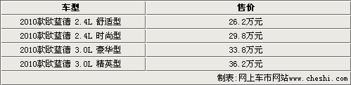 2010款三菱歐藍德共推出四款車型,分為2.4L和3.0L兩種排量,其中2.4L舒適型為兩驅版,售價26.2萬元。其他三款車型均為四驅版,售價29.8萬元、33.8萬元和36.2萬元。據悉,目前2010款歐藍德只有少數展車到店,大部分車型現在都只能預訂,大概需要七個工作日即可提車。