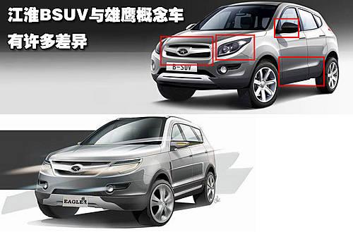 江淮BSUV作為一款小型SUV,體積將會比雄鷹小一號,再者就是前燈、轉(zhuǎn)向燈、后視鏡、輪轂、前包圍等處都有較大改動,肌肉感十足。據(jù)江淮汽車設(shè)計中心介紹,從概念車到量產(chǎn)車的設(shè)計環(huán)節(jié),主要還是為了適應(yīng)市場需求,這也是眾多車企在概念車量產(chǎn)化過程中必不可少的環(huán)節(jié)。