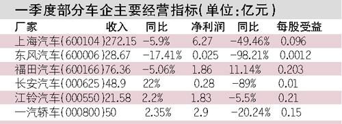 中國汽車工業(yè)協(xié)會的統(tǒng)計數(shù)據(jù)顯示,今年一季度汽車產(chǎn)銷256.76萬輛和267.88萬輛,同比增長1.91%和3.88%。盡管結(jié)束了去年四季度銷量下降趨勢,但從部分披露一季報的上市公司來看,由于一季度汽車銷量增長主要是受小排量車和微客的帶動,而這兩類車單車利潤偏低,利潤豐厚的B級車出現(xiàn)了滯銷情況,導(dǎo)致大量車企出現(xiàn)“增產(chǎn)不增收”的怪現(xiàn)象,利潤同比下降近五成,東風(fēng)和長安的凈利潤下降了八九成,只有個別企業(yè)出現(xiàn)一定車程度的增長。
