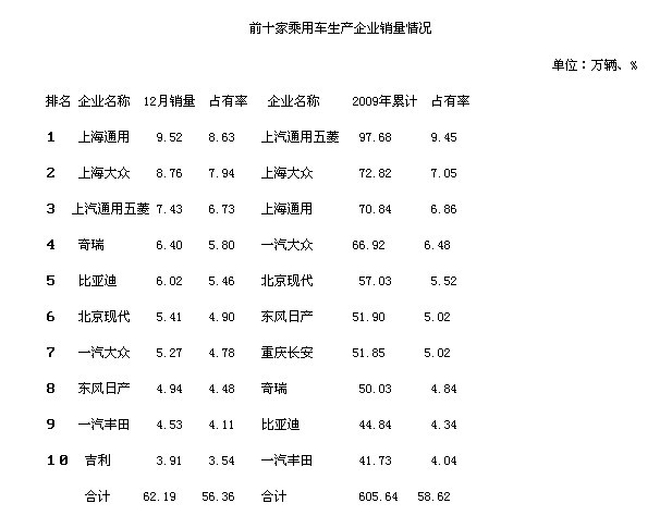 數據顯示,受益于上汽通用五菱、上海大眾、上海通用的聯合發力,上汽去年銷量同比增長了57.23%,其中,生產微型車的上汽通用五菱貢獻了97.68萬輛的銷量,同比增長66.68%,為上汽鞏固霸主立下了巨大戰功。同樣受惠于購置稅減征和汽車下鄉雙重利好、以微型車為主的長安汽車,在整合了昌河、哈飛等微型車企業后,銷量大增至186.98萬輛,縮小了與其他“三大”的差距,并拉開了與“四小”的銷量差距。東風的銷量則是因旗下的神龍汽車、東風悅達起亞和東風日產在2009年均獲得50%以上的增長,公司整體銷量才保持了43.70%的增幅。