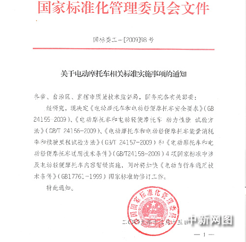 通知稱,2009年12月15日,國家標準化管理委員會會同國務院有關部門和行業協會,共同研究了《電動摩托車和電動輕便摩托車通用技術條件》等4項國家標準的相關問題。考慮到目前電動摩托車是一個新興的產業,制定好一系列相關配套政策還需要一個過程,經研究決定,標準中涉及電動輕便摩托車的內容暫緩實施。