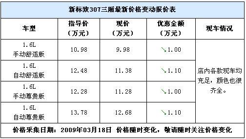 近日,筆者走訪北京雙龍雅致東風標致4S店時了解到,目前店內的307三廂1.6L車型優惠有所加大,目前手動擋車型可以優惠1萬元,自動擋車型可以優惠1.1萬元,店內現車充足,顏色也很齊全,詳細價格信息請見下表: